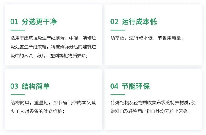 該設備采用高效風選技術,可對裝修垃圾進行精準(zhǔn)分選,顯著提高再生骨料的潔淨度,使其能夠(gòu)作為(wéi)優質路基材料或再生建材使用;分選出的(de)輕物(wù)質則(zé)將轉化為SRF(固體(tǐ)回收燃料),實現廢(fèi)物資源化與能源化利用,進一步提升項目環保效益(yì)與經濟價值。