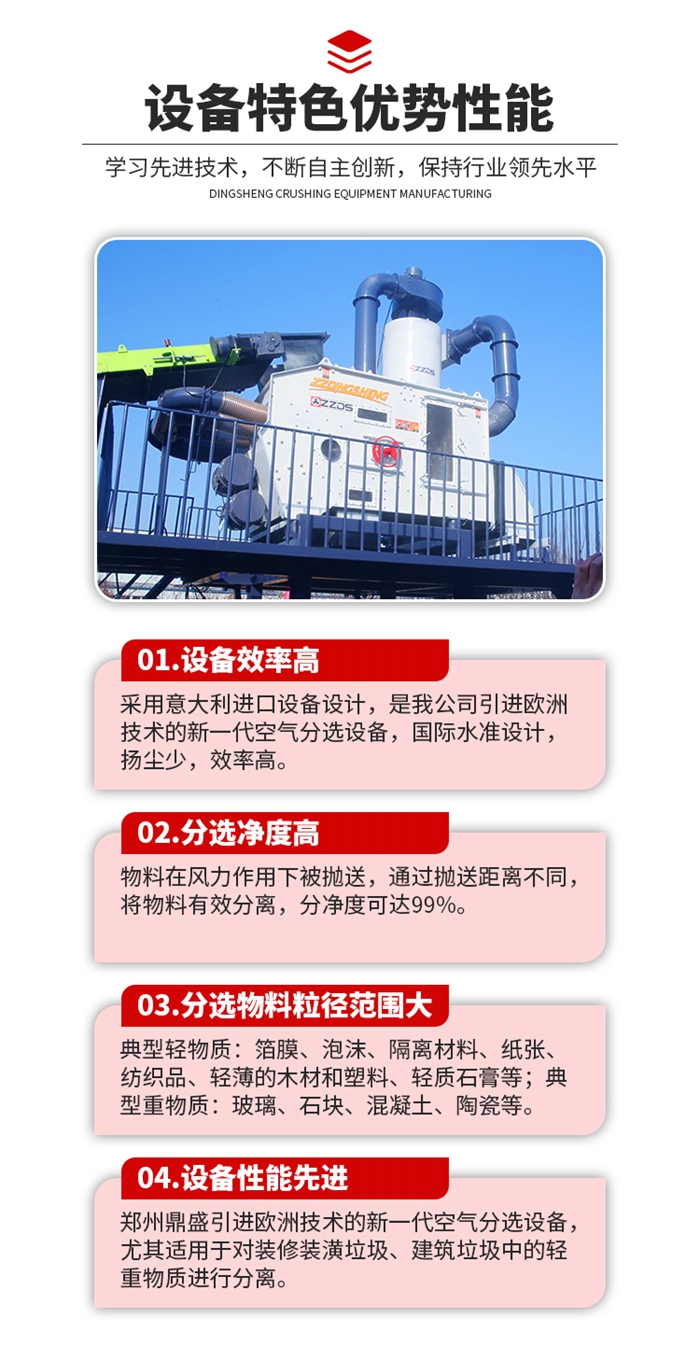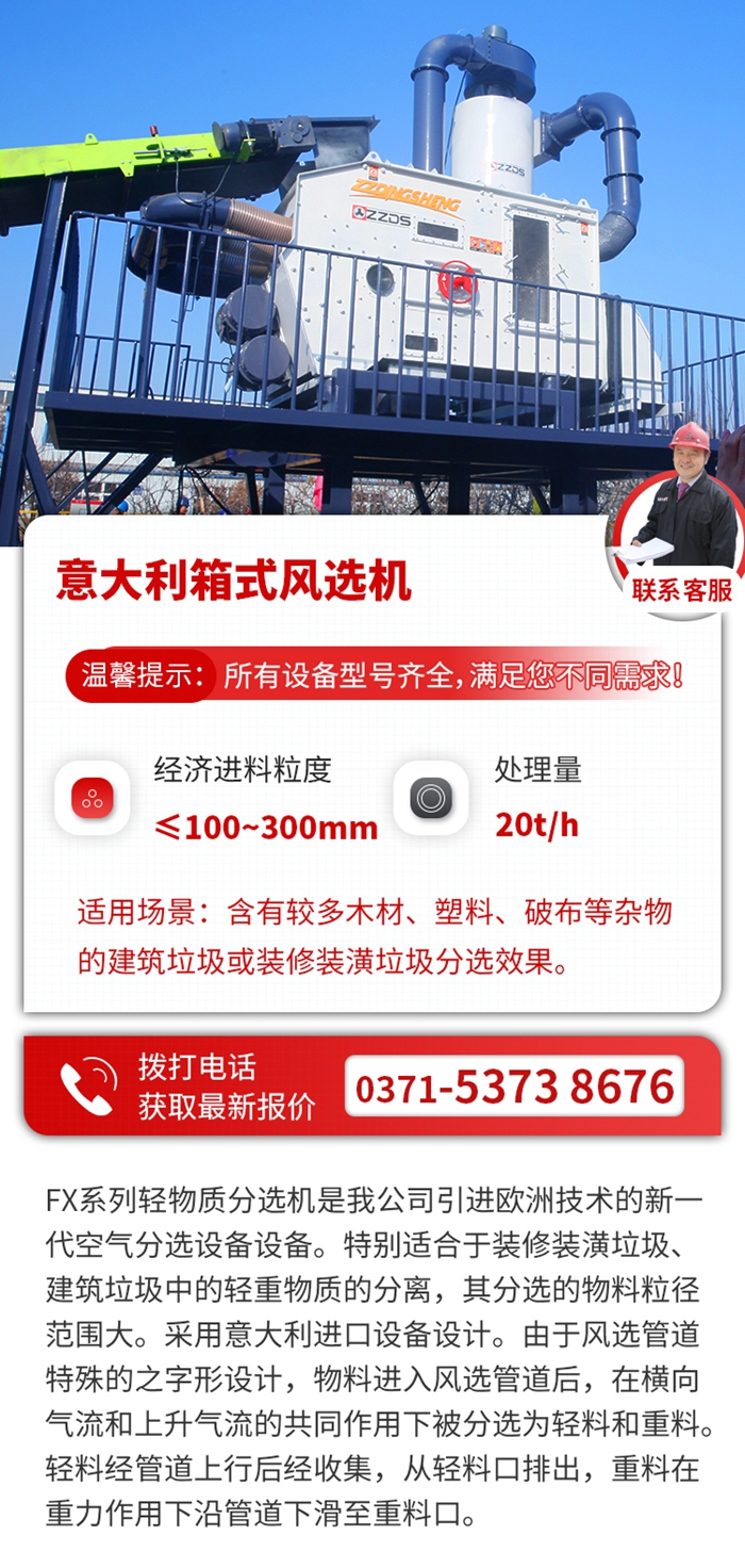 裝修垃圾風選機的基本原理是利用(yòng)風力將廢棄物中的輕質物質,如塑料、紙張、木片等物質吹起,然後通過收集裝置將其收集。同時,較重(chóng)的物質如磚塊、石(shí)頭、玻璃等則會沉到機器底(dǐ)部,並通過出口排出。