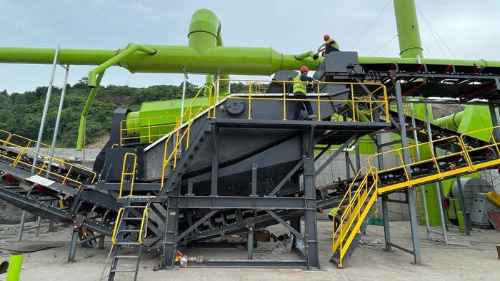 核心(xīn)設備:鵝頸(jǐng)式輕型板(bǎn)喂機和中型板喂機,全密封輸(shū)送(sòng)帶,負壓臥式風選機、階梯棒條篩、人工+智能化機器人聯合分揀平台、雙軸撕裂機、除鐵器、除塵器等。