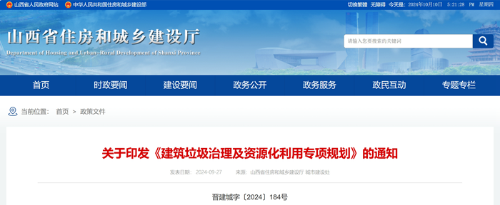 2024年9月15日,山西省住房和城鄉建設廳印發《建築垃圾治(zhì)理及資源化利用專項規劃(huá)》,加快完善建築垃圾源頭減量、分類投放、中端收運、末端處置的全過(guò)程(chéng)監管體係,全麵提升全省城市建築垃圾規範化管理和資源化利用水平。