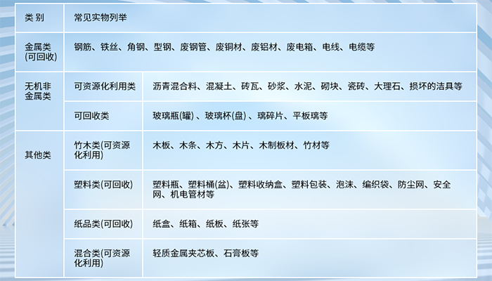 該(gāi)目錄所規定的建築垃圾,不包括工程施工或拆裝活動中產生的危險廢物、工業固體廢物、生活(huó)垃圾(含大件垃圾)。施(shī)工或拆裝現場產生的廢(fèi)礦物油、廢塗料、廢粘合劑、廢(fèi)密封劑、廢瀝青、廢石棉、廢電池等危險廢物,按照《國家危險廢物名錄》的規定執行;工業固體廢物按照工(gōng)業固體廢物的標準規(guī)定執行;生活垃圾(含大件垃(lā)圾),按照《浙江省(shěng)城鎮生活垃圾分類標準》(DB33/T 1166-2019)的規定執行。