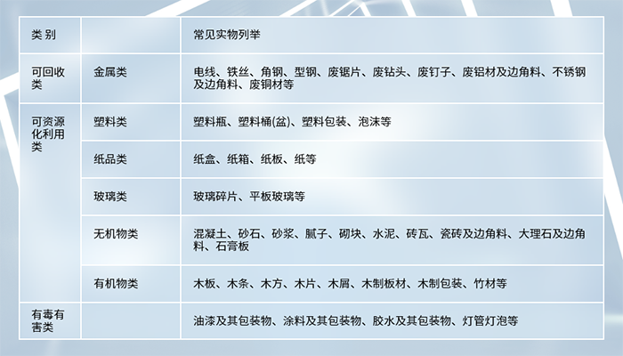 房屋裝飾裝修前在(zài)清除、騰空等環節產生(shēng)的生活垃圾(含大件垃圾),以及在裝飾裝修過程中產生的生活垃圾(含(hán)大件垃圾),應當執行《浙江省城鎮生活(huó)垃圾(jī)分類標(biāo)準》(DB33/T 1166-2019)的類別(bié),並按照《浙江省生活垃圾管理條例》的(de)規定納入生活垃圾分類管理。