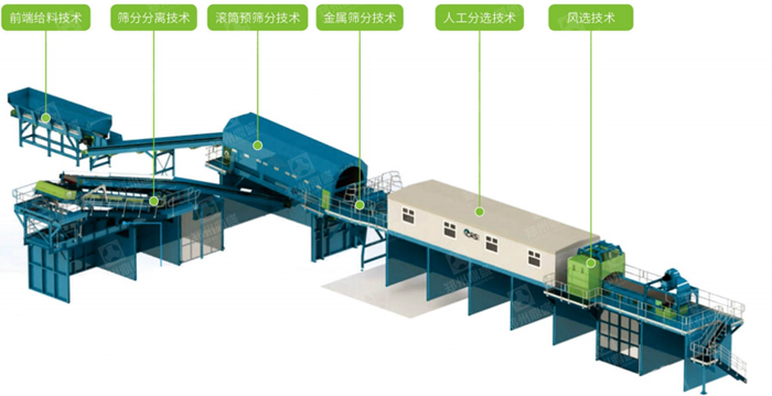 裝修裝潢垃圾處理係統采(cǎi)用“先分選後破碎,重分選而輕(qīng)破碎”的工藝理念,避免(miǎn)將雜物隨物料過度破碎反而增加分選的難度(dù)。