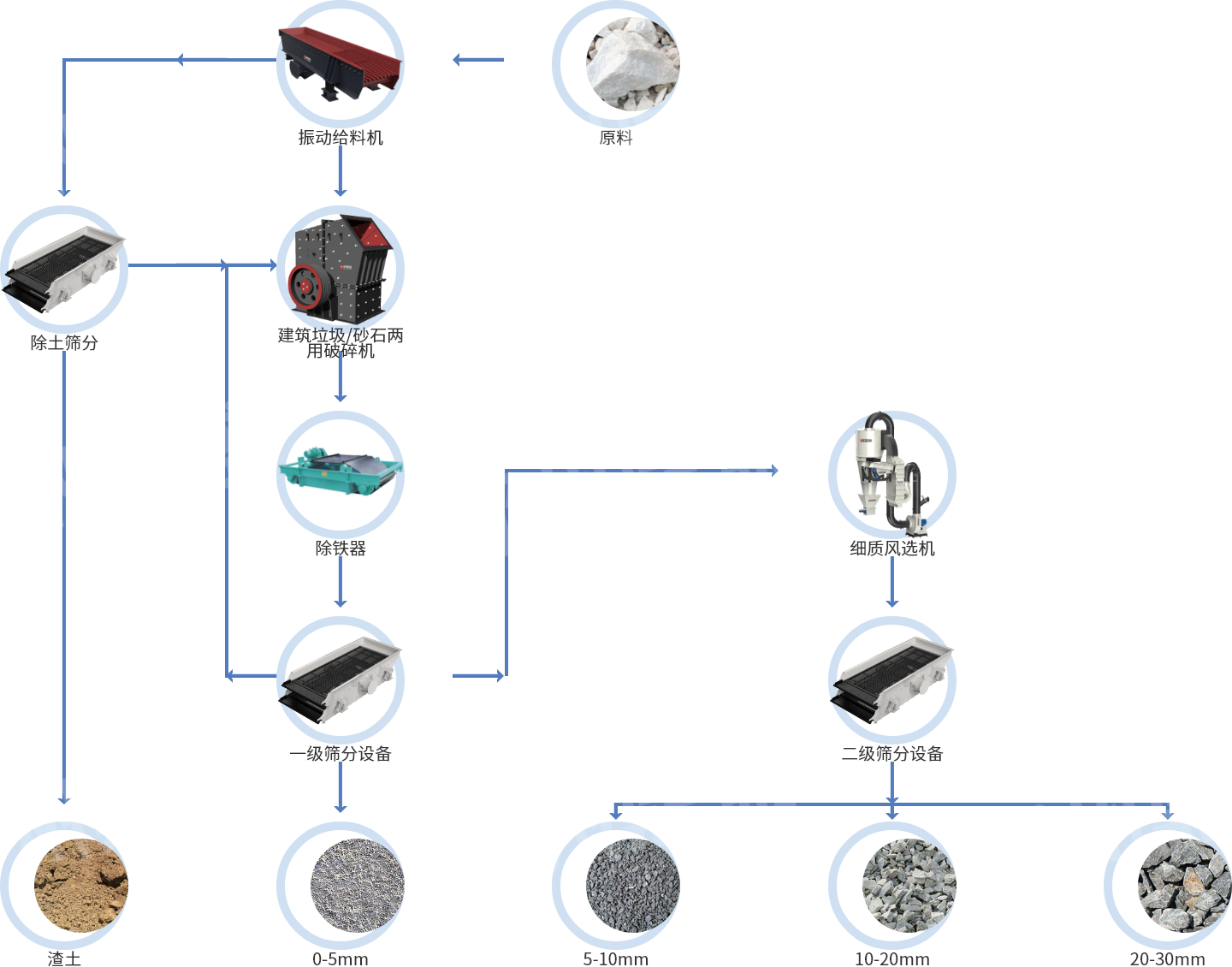 “二合一”生產線是什麽呢?該生產線是指通過專(zhuān)用設備(bèi)、合理的工藝布局,將建築垃圾、砂石骨料處理生產工藝合(hé)二為一,可根據砂石骨料的岩石特性及建築垃圾的(de)不同構成進行靈活配置,專用設備合理搭配,輔助及工藝設備共(gòng)用,處置產能不變,廠房占地麵積顯著縮減,投入成本大幅降低,大大提高設備(bèi)運轉率(lǜ),從而創(chuàng)造更大的經濟效益。